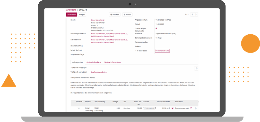 Create your documents easily and quickly with ITISeasy.business. By linking ITISeasy.business with ITISeasy.docs, the desired documents (such as quotes, orders, invoices, etc.) can be uploaded into the integrated document management system automatically or manually (via drag & drop).